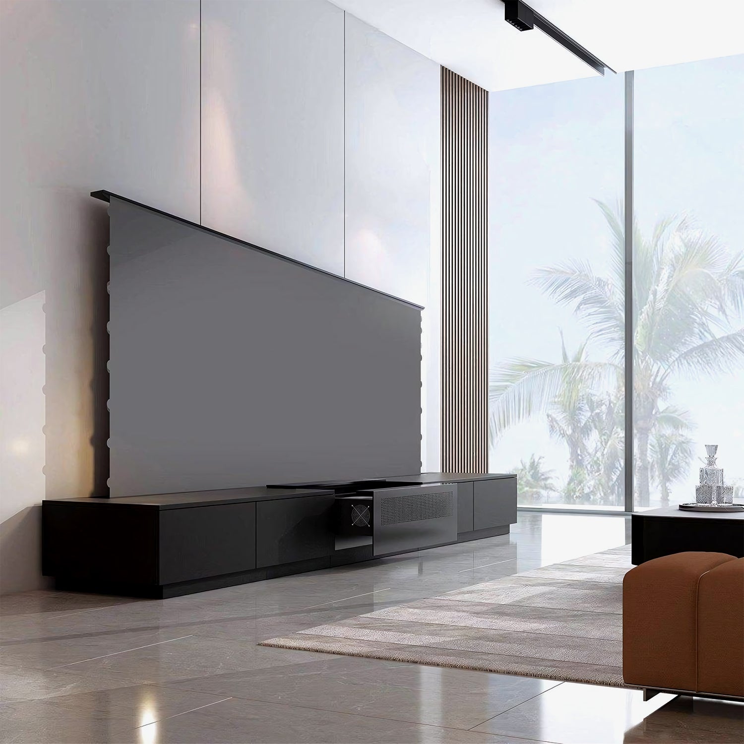 On-wall speakers and acoustic panels work together to deliver clear, immersive sound with balanced, theater-quality audio.