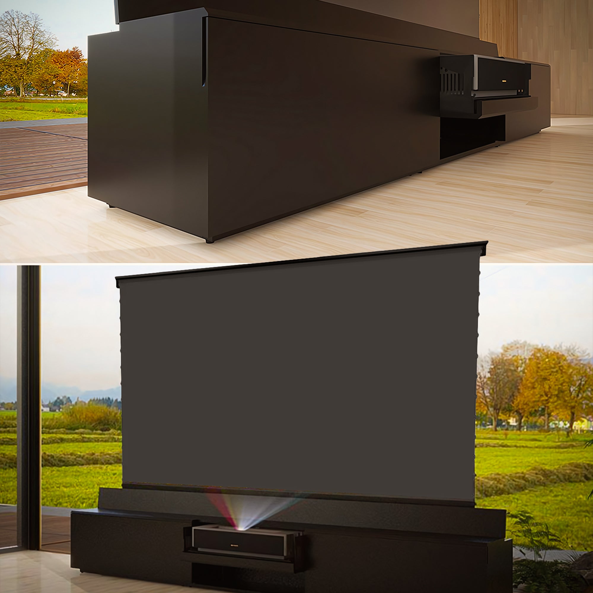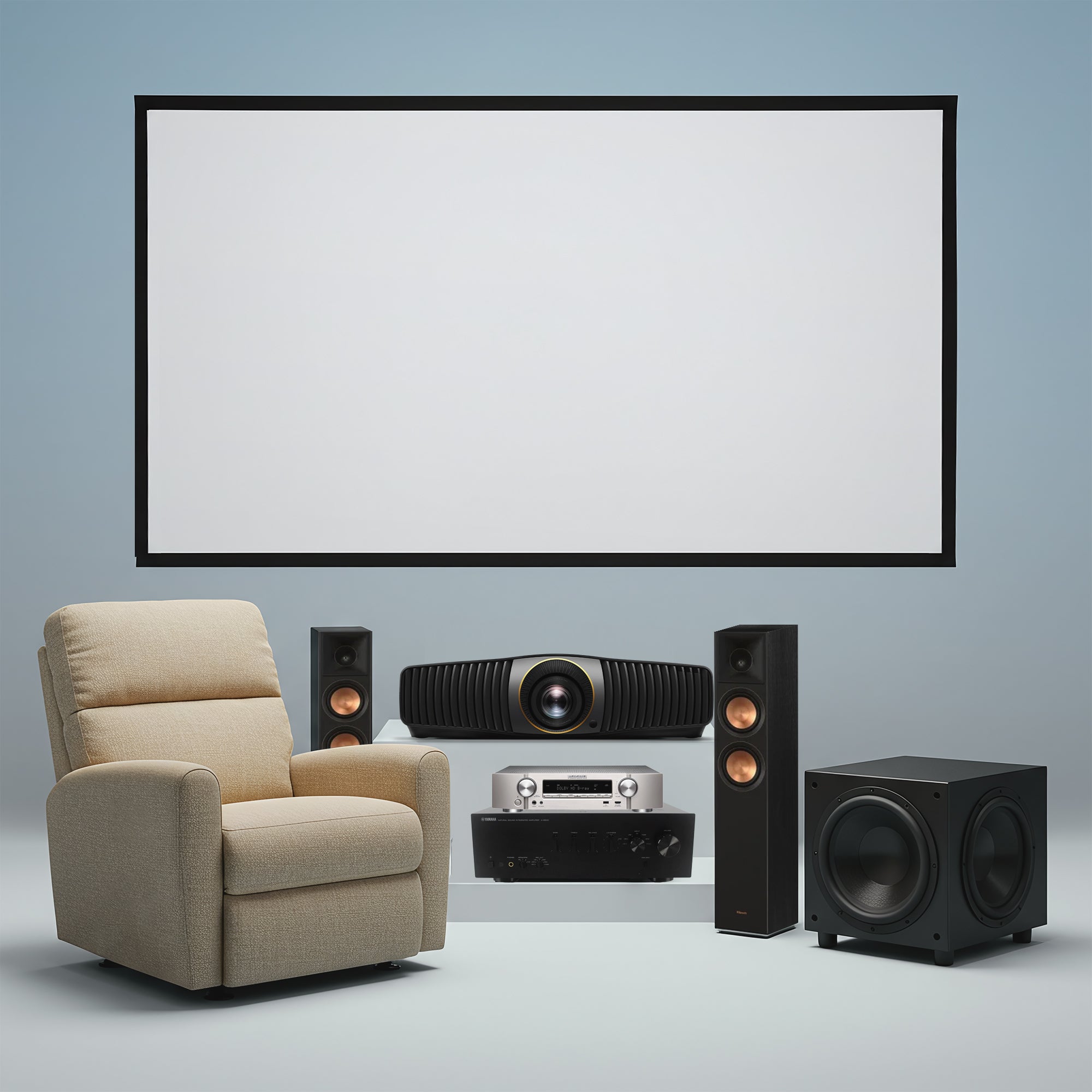 The projection screen enhances clarity, brightness, and color for a sharp, cinematic viewing experience.